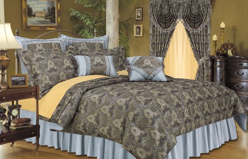 This luxurious bed ensemble features intricate jacquad pattern with gold accents. Decorative pillows with tassel fringe are included. Coordinate euro shams, matching drapes, valance and sheets available.