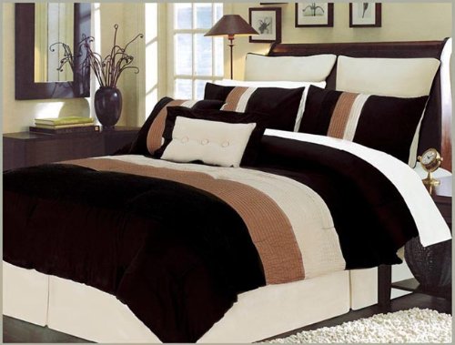Make a true decorating statement with this exciting 8PC Luxury comforter set. Outer surfaces made of 100% cotton. This set includes 1 over-filled and oversized KING 106x92 polyester filled comforter, 2 king 20x26 shams, 2 Euro shams 26x36. 1 decorative breakfast Pillow 11x16 with 2" flanged outside edge. 1 decorative square pillow 18x18 and 1 bed skirt with center foot and center side box pleats. Corner pleats on bed skirt will accommodate a bed rail. All items are easy care machine wash & dry. Read more...