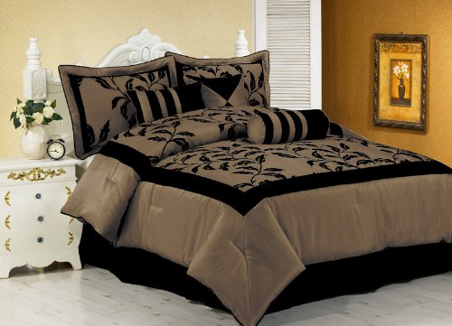 This flocking leaf pattern on faux silk with black border will give your bedroom a sophisticated styling. 3 decorative pillows included. Beautiful matching curtains also available.